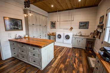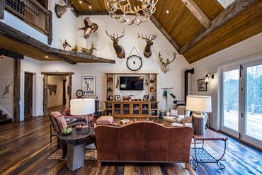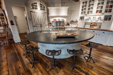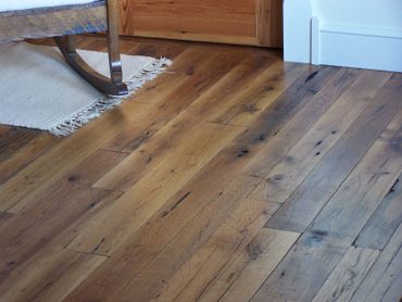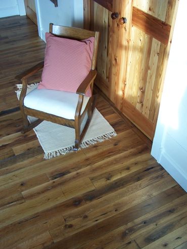 Rustic Blue Ridge Barn Oak carries most of the original character of the reclaimed planks. The color, character, saw marks, nail holes, worm holes and patina are unique to each board. Floor finished with Waterlox Satin Finish. Board Widths: 6, 7 & 8 inches.