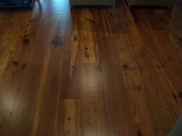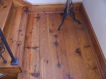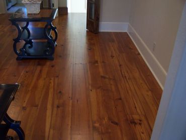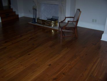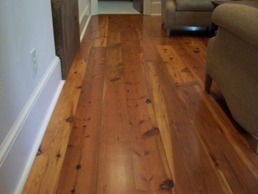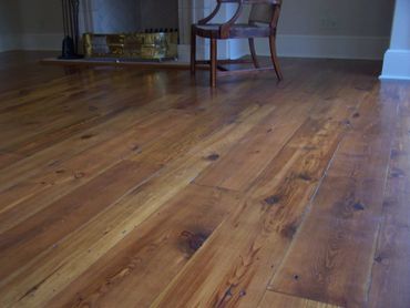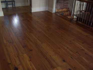 Milled from recently timbered pine logs, the Eastern White Pine wide plank flooring is face-nailed with antique cut nails and is the enduring classic colonial, as well as farmhouse, look. White pine is available as Pumpkin, with its rich, mellow pumpkin color, or Blued, which has blue, gray and coffee-colored stains. White Pine is softer than other wood floors, so it may "distress" with use. Finish with Waterlox Satin Finish for a beautiful finish.