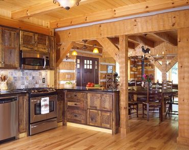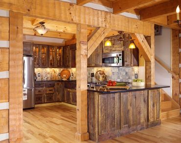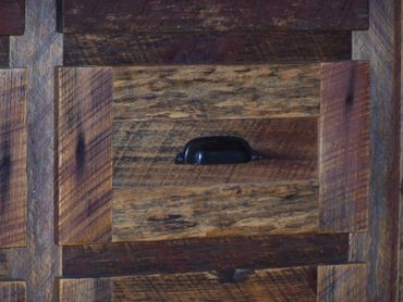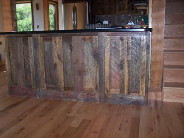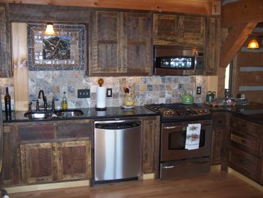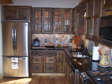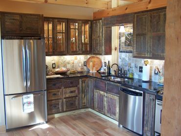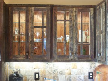 These Reclaimed Poplar Red-Board kitchen cabinets were crafted from the wood salvaged from the old barn that once stood on the same property. Our clients added extra touches with unique divided light glass uppers, Reclaimed American Chestnut back panels and antique wavy glass.