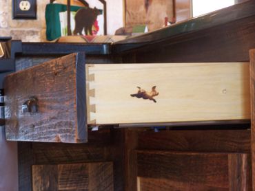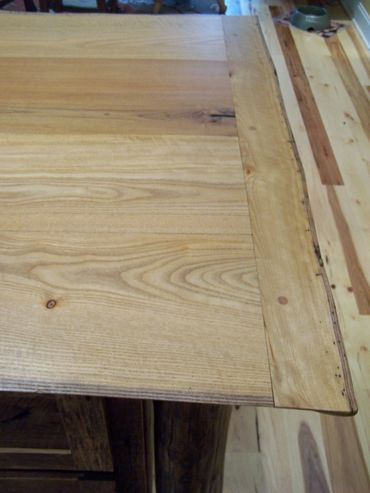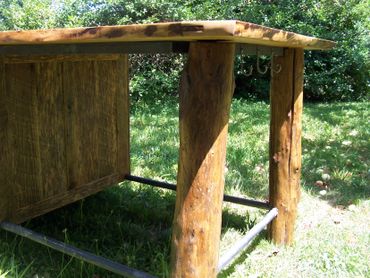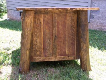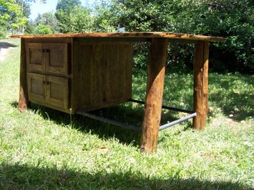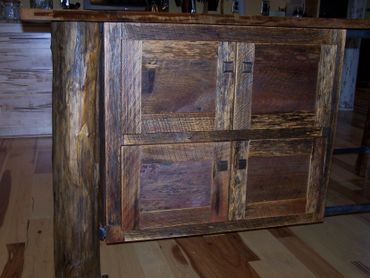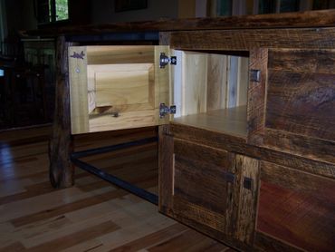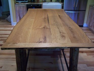 After a few design changes, our clients let their personalities speak with this one-of-a-kind kitchen island. Reclaimed American Chestnut poles for the legs and Reclaimed Poplar Red-Board for the cabinet. We commissioned a local metal shop to construct and finish the frame, and a local blacksmith to hammer the hooks. We didn't stop there. We pulled some of our wide plank Sassafras for this spectacular live-edge breadboard top.