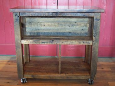 This kitchen island was truly built for utility (and aesthetics) for use in our client's loft. Compact, but functional for cook books and pots/pans. The rustic Reclaimed American Chestnut base and polished Walnut top were perfect complements. The locking casters were added to add extra functionality in a smaller space.