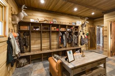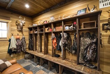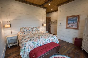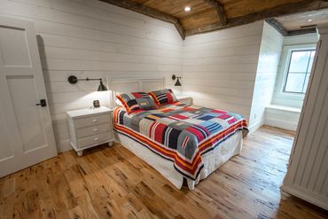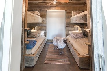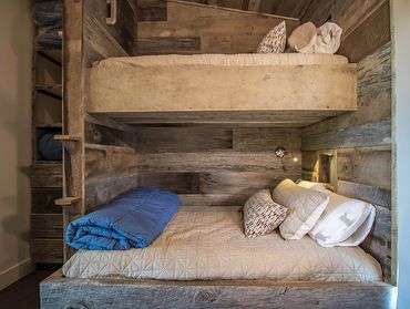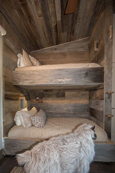 The walls of this bunk room (along with bunks) are clad in wide plank, reclaimed poplar (mix of gray-board and brown-board) for a rustic shiplap look.